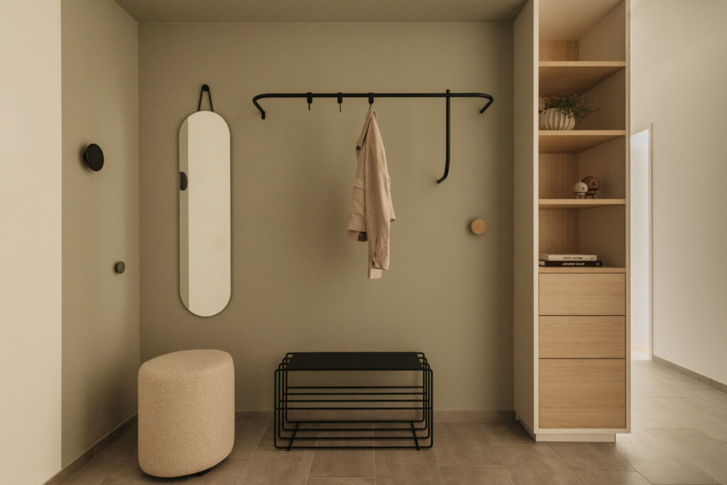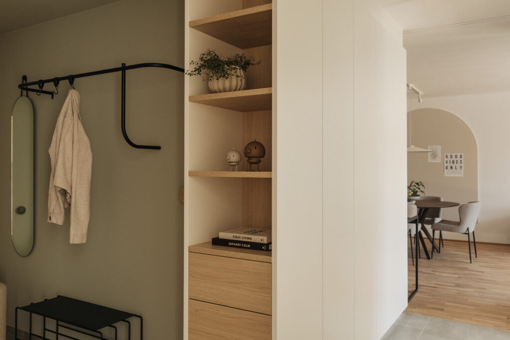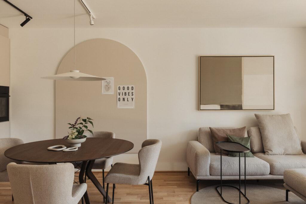 Die Einrichtung verbindet moderne Klarheit mit wohnlicher Wärme. Natürliche Materialien, eine dezente Farbpalette und ausgewählte Texturen schaffen eine Atmosphäre, die Ruhe und Offenheit vermittelt. Jeder Raum wurde so inszeniert, dass er die architektonischen Qualitäten der Wohnung betont – ohne dabei überladen zu wirken.